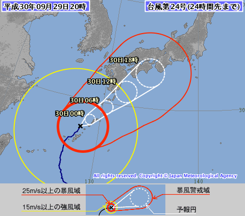 まずは大型で強い勢力のまま上陸が予報されている台風24号。