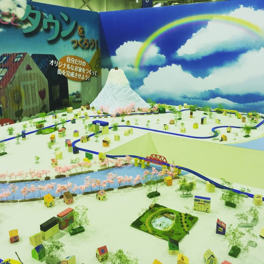 今回は、まるごとタウンブース担当となり、家の形をした木に色を自由に塗ってもらい、好きな場所に置いてもらって、町並みをつくってもらいました!