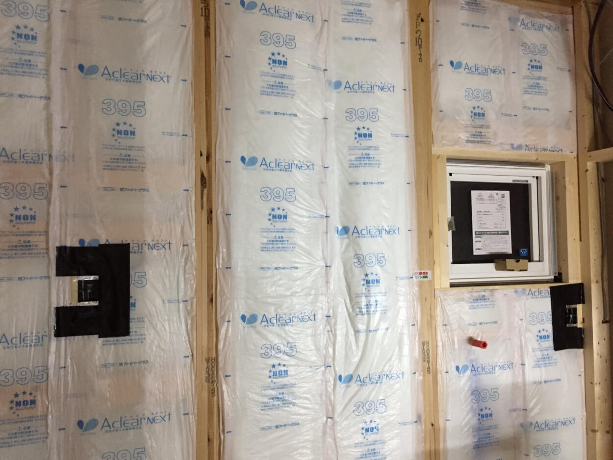 S様、壁の断熱材も入れ終わり、この上にプラスターボードを貼っていきます。