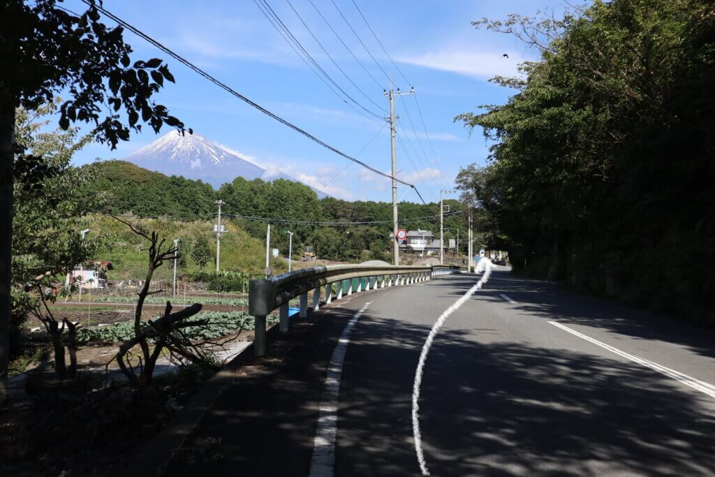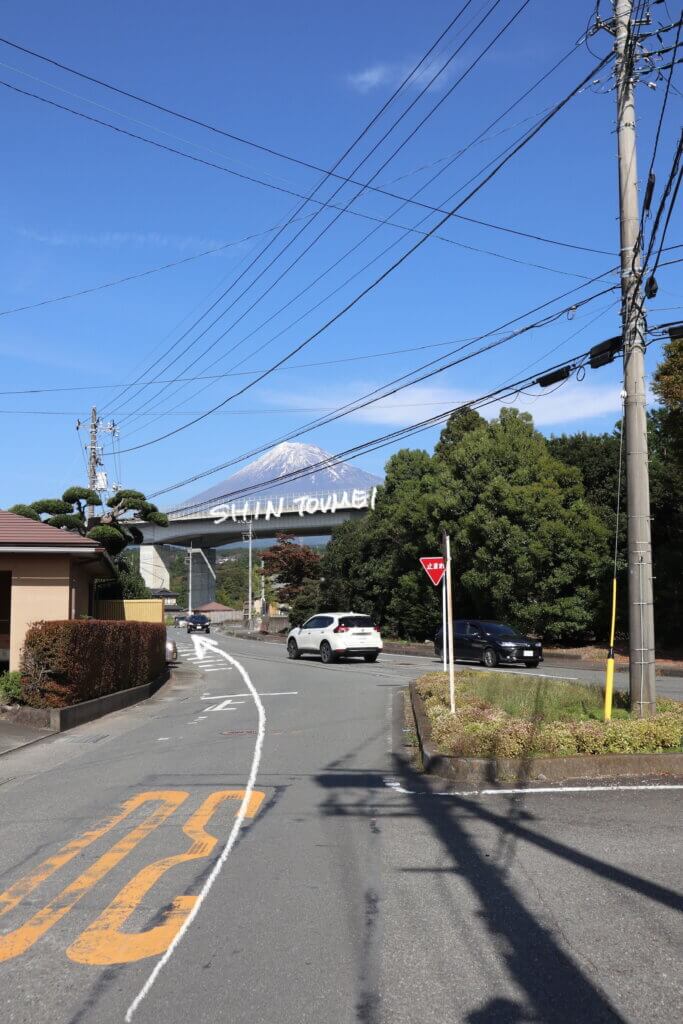 右手に吉原自動車学校のある交差点を左折します。先程よりは道もいくらか狭くなり、走る車は地元の方でしょうか。商店などは見当たらないので、ただまっすぐに道を進みます。右手を走る道路と合流するポイントへやってきました。進行方向には富士山と新東名高速道路が見えます。