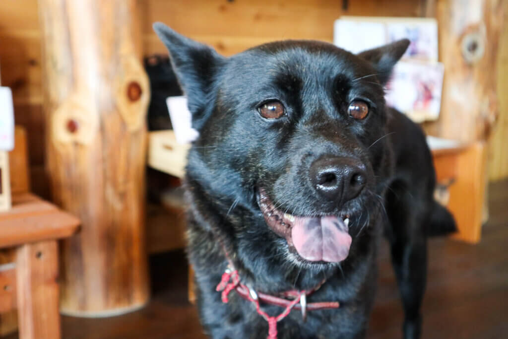 よく見ると敷地内をワンチャンや猫ちゃんが自由に行ったり来たり。お客様も自由に触れ合いを楽しんでいます。まさにファーム! 癒しの空間。 看板犬ハルちゃんにご案内いただき、カフェスペースへ。