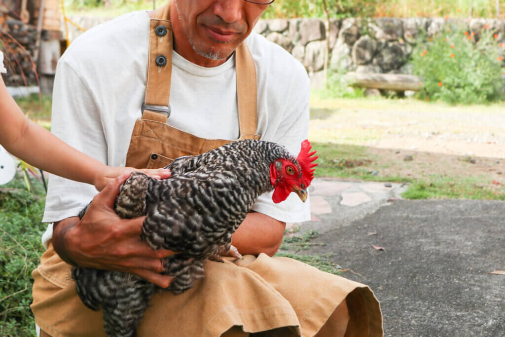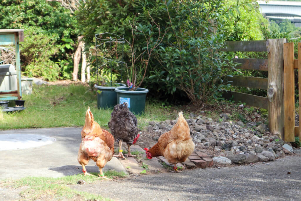 土を掘ったり、雑草をちぎったり、ときに足を使い器用に体へ砂をかけたり。この砂浴びは、羽についた汚れや虫を落として体を清潔に保つことへもつながるそう。昼間は敷地を自由に散歩して、食事時になるとちゃんと戻ってくるそうですよ。のんびりとした景色の中で生き物と触れ合える時間。