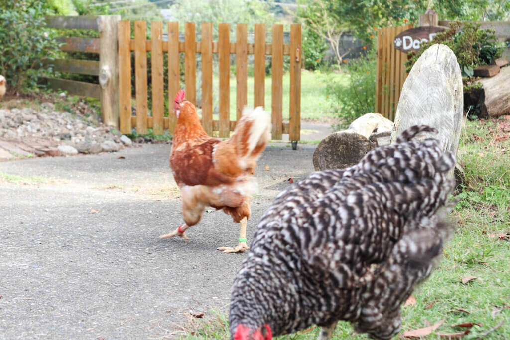 どうやらここから上り奥へ進むようです。駐車場所に迷っていると、すぐさま「こちらどうぞー」とオーナーさんが誘導してくれました。ありがとうございます!お子様連れのご家族や、バイクに載る男性の姿も。そして目の前を鶏がテクテクと歩いています!