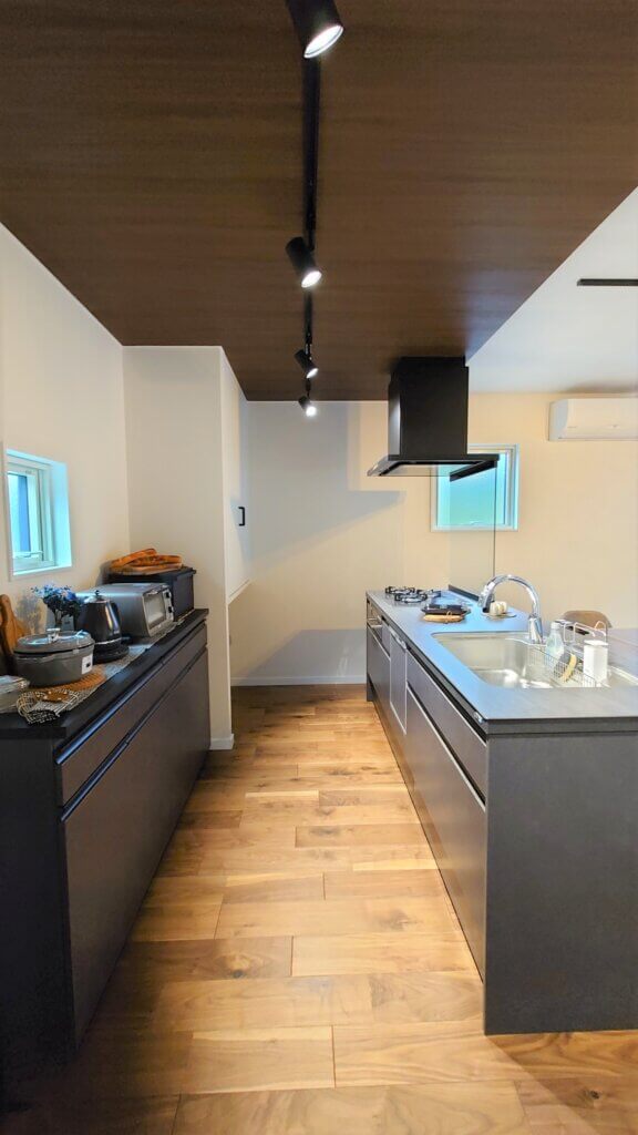 背面収納のカウンターもブラックにしたことです