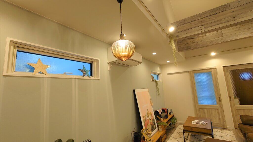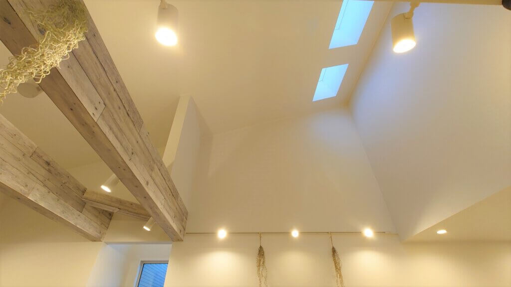梁なしのスッキリ勾配天井のインダストリアルスタイル