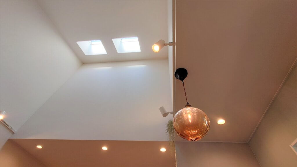 梁なしのスッキリ勾配天井のインダストリアルスタイル
