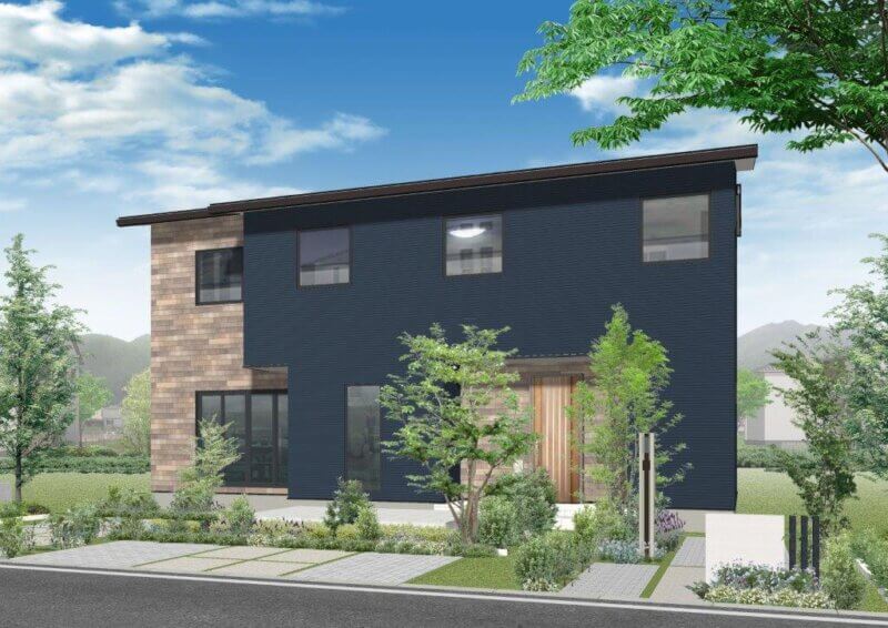 ネイビーとウッドタイル調のサイディングが素敵なお家