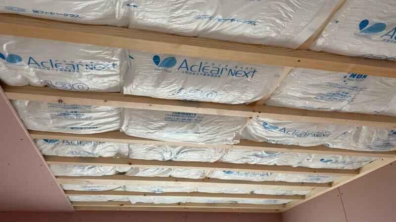 HIBIKI PREMIUMの天井断熱材は高性能グラスウール「アクリアネクスト10K100mm厚」を2枚重ねて入れます=通常10cmのところ、20cm!