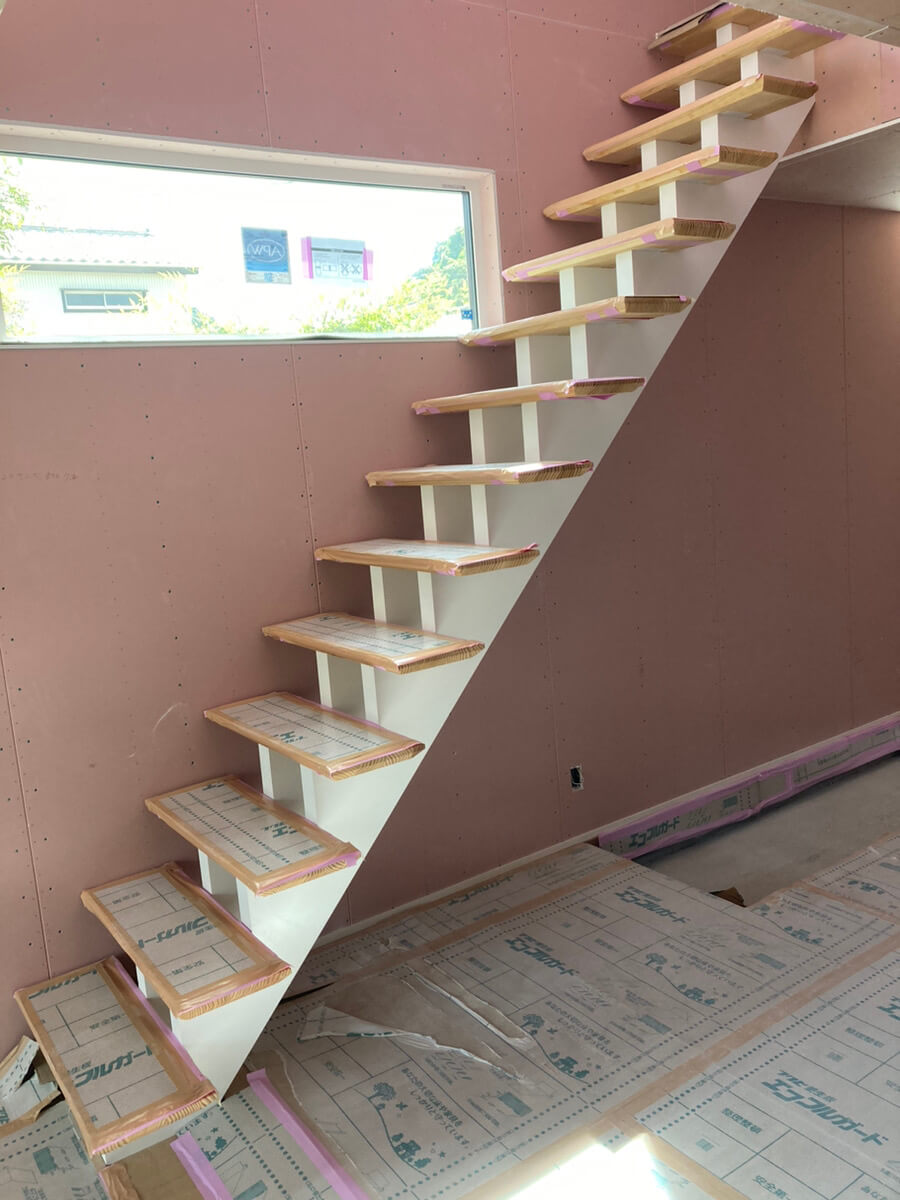 先日、途中経過をお伝えした、ウッドワン殿商品のデザイン階段取り付け完了しました! このあとクロス工事・仕上げと進んでいきます。階段には鉄骨手すりが付きます。 (ウッドワン殿カタログイメージより) こちらの現場はお施主様のご厚意により完成見学会でご覧いただけます。 6/15(土)16(日)藤枝市岡部町にて 玄関を入ると、階段とリビングがお出迎えしてくれます。キッチンは控えめな場所に配置お風呂は1階ですが洗濯は2階で考え抜かれた配置動線です。 ご期待下さい!