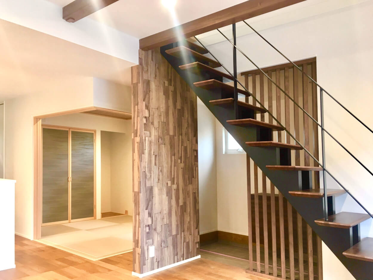 S様のお住まいの特徴といえば、「デザイン階段を中心にリビングと土間と和室と2階がつながる、家じゅうがつながるお住まい。