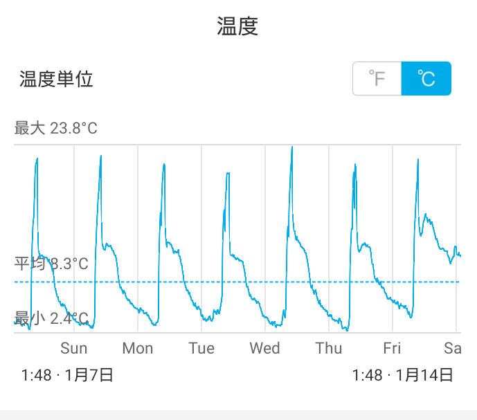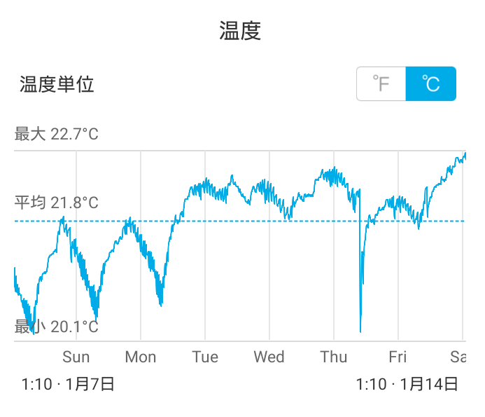 実際の先週(1/7~14)の外の気温とキッチンの温度です。