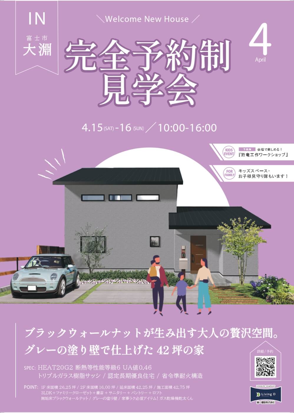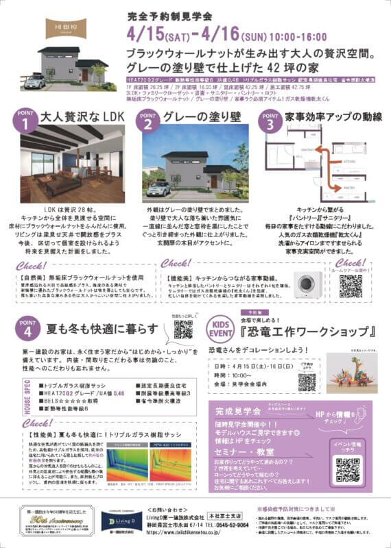 今月のチラシが完成しました🌟4/15㈯・16㈰開催する予約制完成見学会です!床材はブラックウォールナット、建具はブラックと濃い色味を使用した高級感あふれるお家です。<LINE>下記ボタンより(24時間受付)