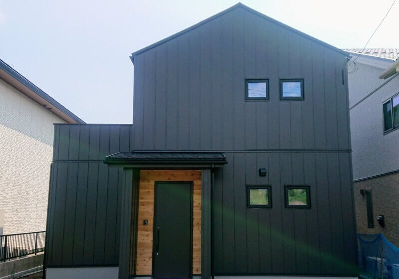 外観がブラックの縦張りのガルバリウムと玄関に木製のサイディングを使ってます。