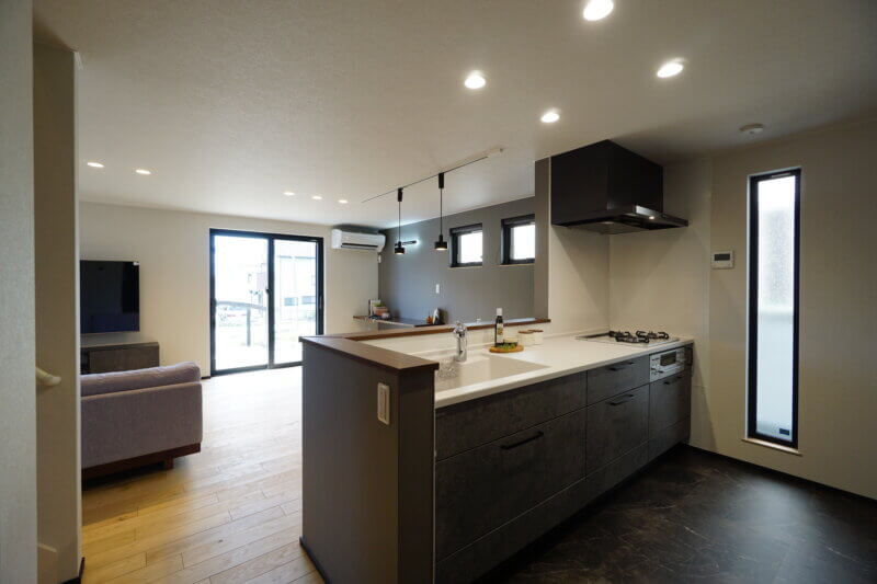 扉やアクセントクロスのダークな色合いともピッタリで素敵なお家になっています。