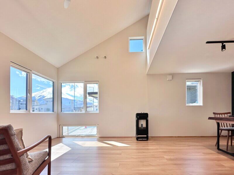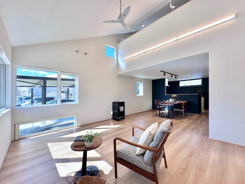 22帖のLDKは、勾配天井と吹き抜けにより開放感がUP!!!ペレットストーブで暖かさと心地よさを感じられる空間🔥