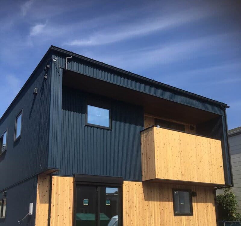 ネイビーのガルバリウム鋼板に杉板のアクセント