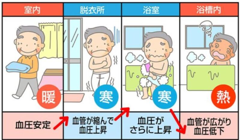 心筋梗塞や脳梗塞をおこすことがあり、特に冬場に多くみられ脱衣所や浴槽で注意が必要です。