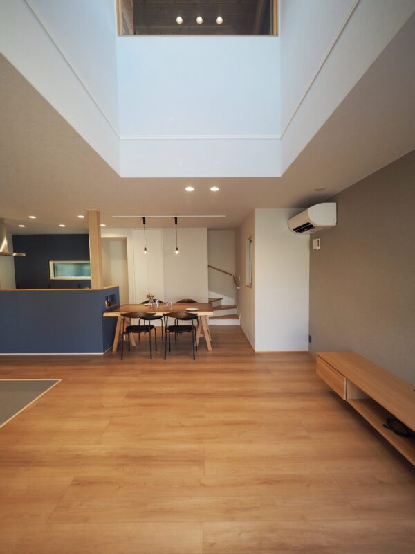 リビングは吹抜けと大きな窓で開放的な空間。