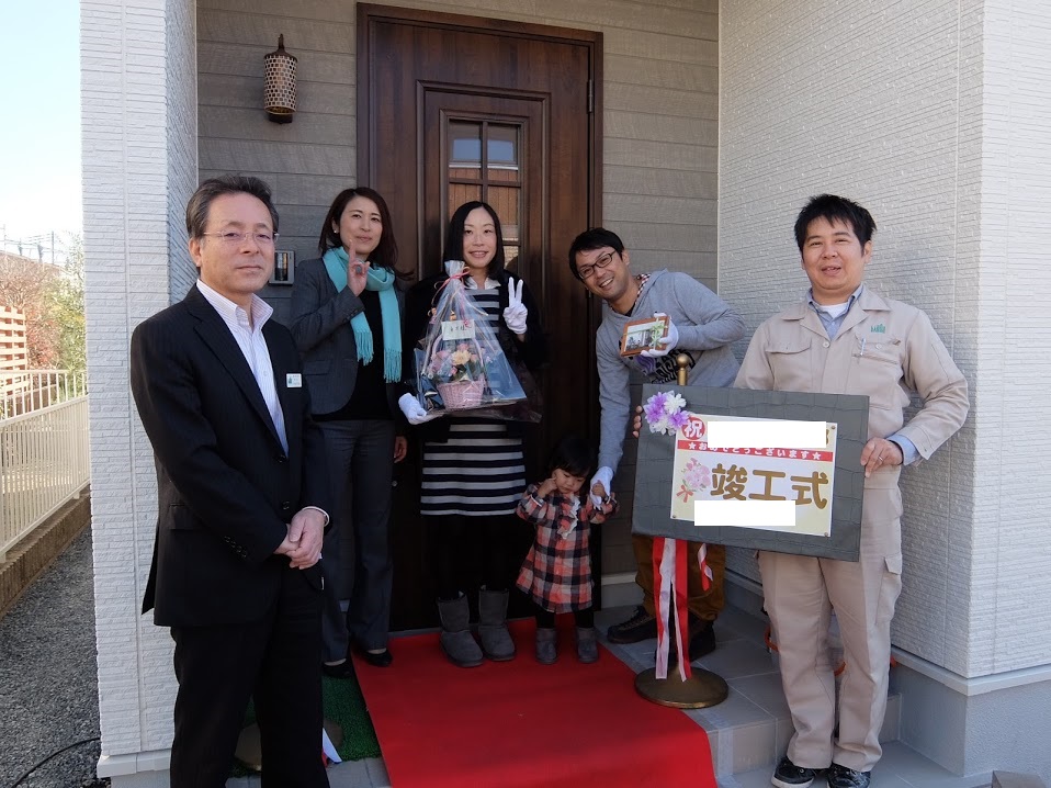 本日は、竣工式おめでとうございます。今日の日のお喜びをお客様より一言お願い致します。 「夢のマイホームを手に入れる事ができました。色々な要望に丁寧に応えて下さった第一建設の皆様、 ありがとうございました。今では家族が一人増えて4人で楽しく快適に生活しています。 これからも長いお付き合いよろしくお願い致します。」