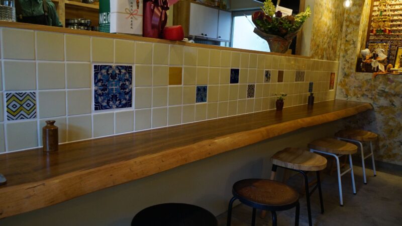 一枚板のカウンター越しに会話が生まれるのも、