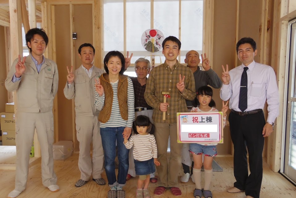 本日は、上棟式おめでとうございます。今日の日のお喜びをお客様より一言お願い致します。 「本日は、家族そろって上棟式に参加させて頂きありがとうございました。子供たちも“ピン打ち”と言う貴重な体験をする事ができ大変喜んでいました。ここから完成まであと数ヶ月ありますが、とっても楽しみです。」 ※メッセージと写真は、お客様よりご了承頂いたものを掲載しております。