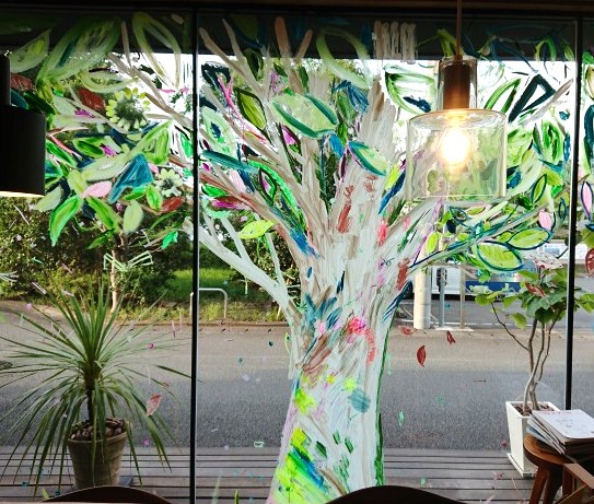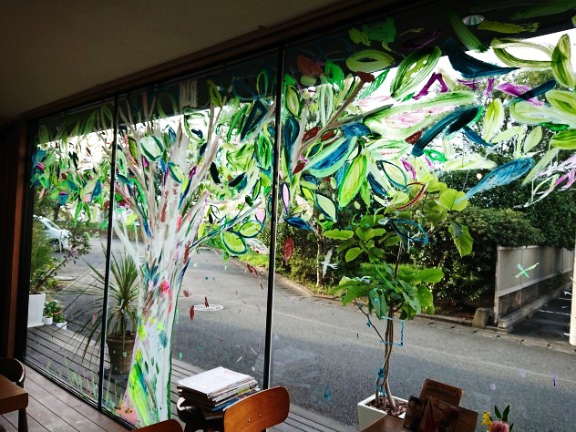 ALTANAカフェの窓ガラスの木の絵も子供たちと一緒に手がけた