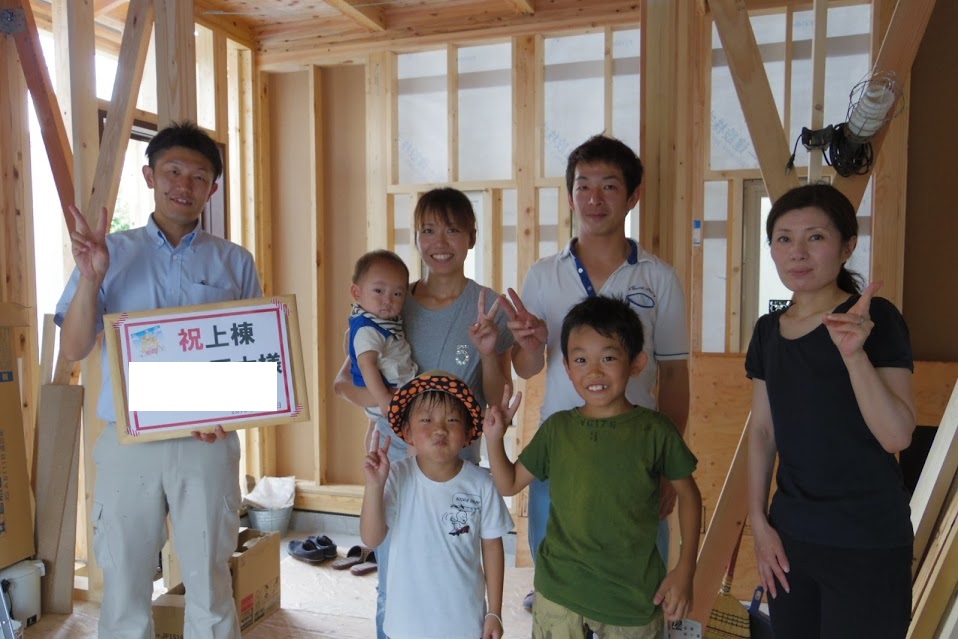 「本日は、お暑い中ピン打ち式を執り行って頂きありがとうございました。あっと言う間に上棟し、家を建てていると実感しました。骨組みだけの家に入り、子供達もドキドキしている様子でしたが、