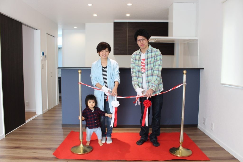 本日は、竣工式おめでとうございます。今日の日のお喜びをお客様より一言お願い致します。 「無事に竣工式を迎える事ができました。大勢の方々のご協力があり、想像以上の素敵なお家が出来ました。 これからこの新しい家での生活がとても楽しみです。ありがとうございました。 今後も末永いお付き合いをよろしくお願いします。」 ※メッセージと写真は、お客様よりご了承頂いたものを掲載しております。