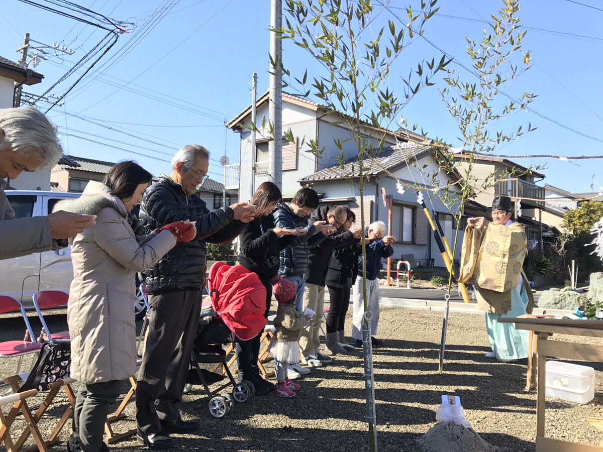 『本日は、ありがとうございました。寒くて風の強い中、段取り良く進めて下さり、これから家が出来ていく過程がより楽しみになりました。親戚大勢に見守られて無事地鎮祭を出来た事が幸せです。彩音も参加できて良かった!ご近所さんも優しそうで安心しました。!』