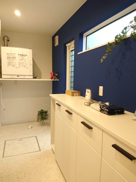 広いリネン室にブルーのアクセントクロスにガス乾燥機