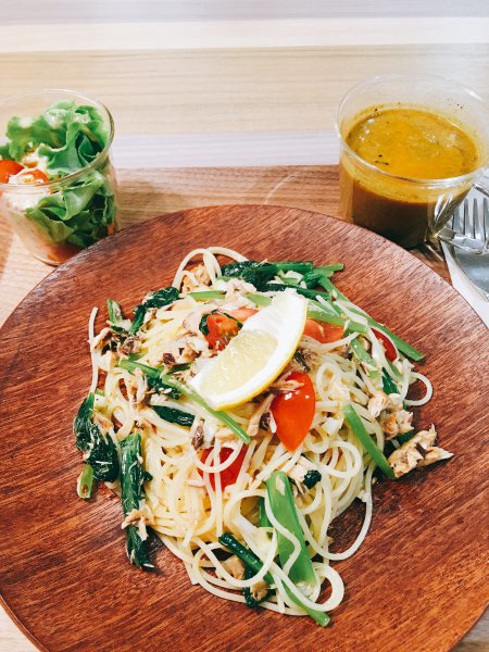 私は、パスタ+サバプレッソ(サバカレー)笑