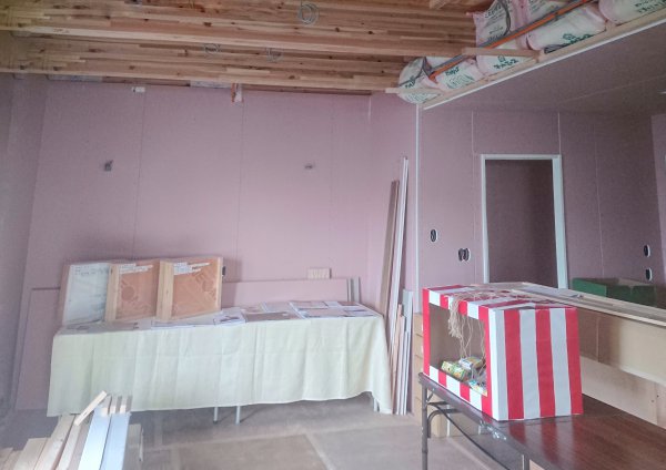 お家も構造梁がみえたりクロスを貼る前のボードの状態になっています。
