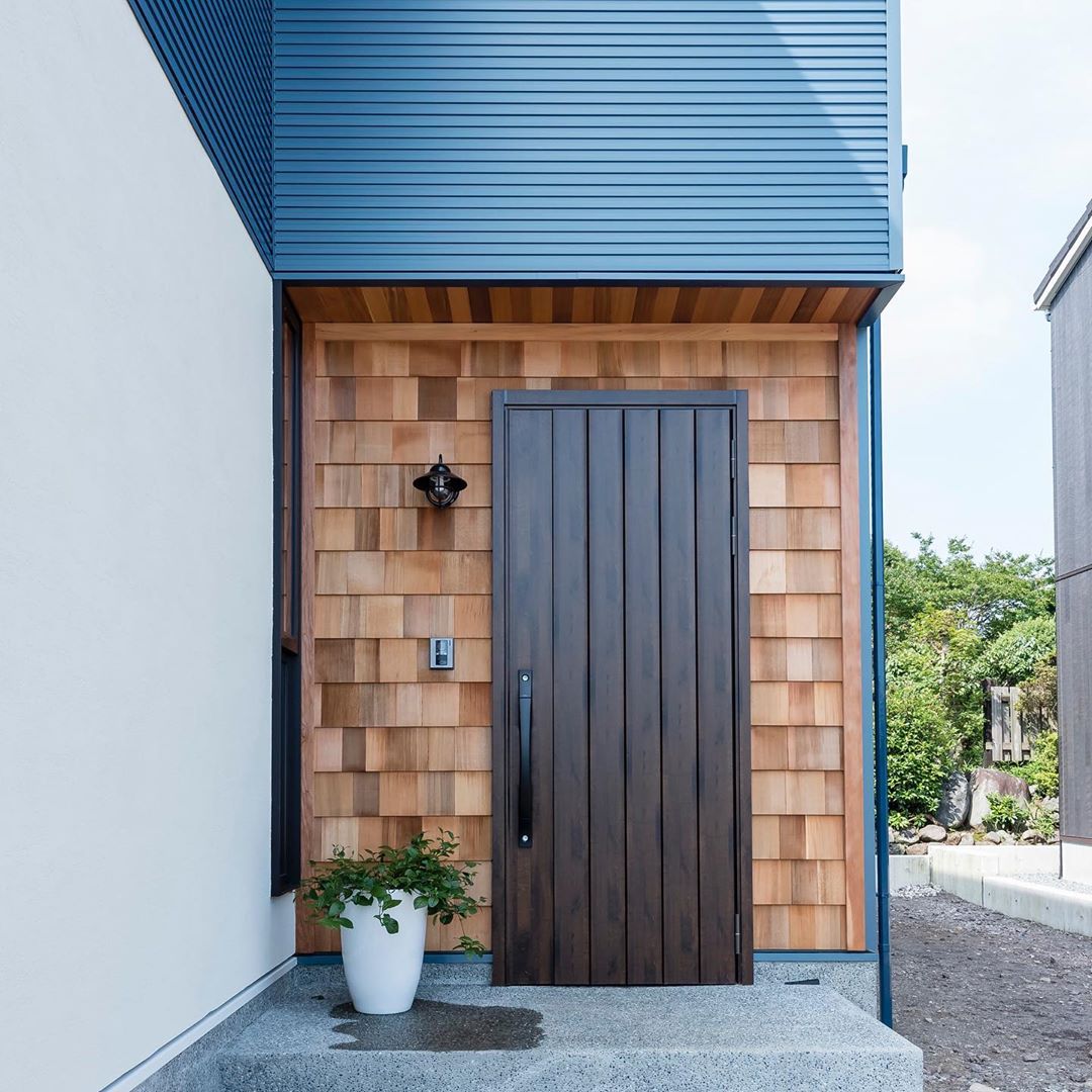 ネイビーの金属外壁と白い塗り壁で合わせる。