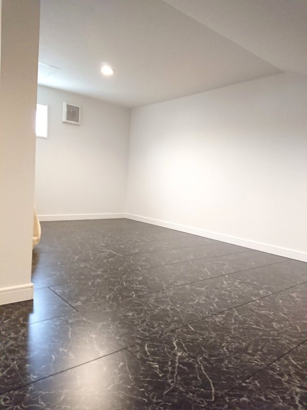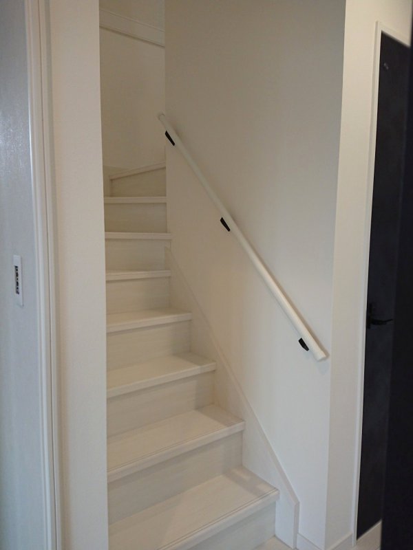 真っ白い階段からブラックの大理石調の床へ続く収納部屋