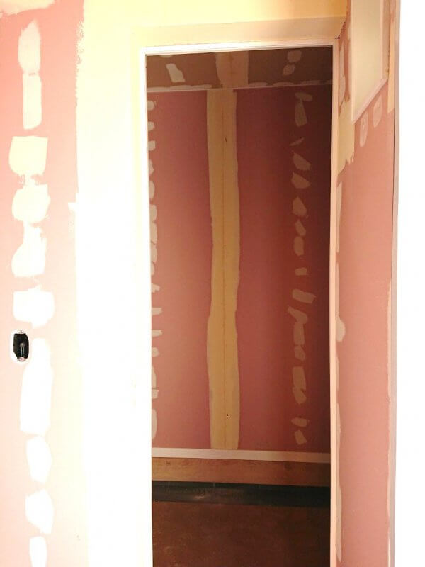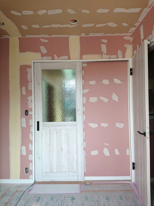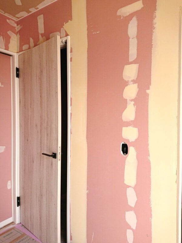 ピンク色のプラスターボードにパテ処理をされている玄関ホール