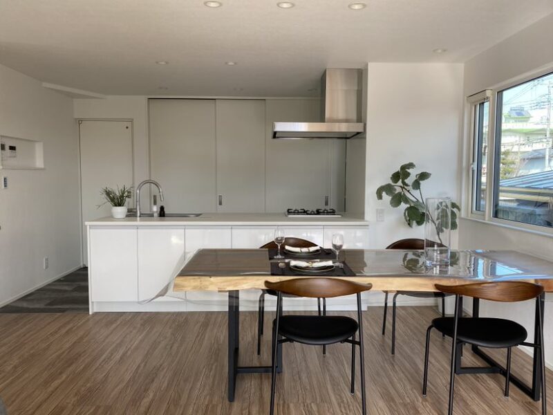 白くてオープンなスッキリしたキッチン。キッチン後ろの収納も扉で隠して見えないように