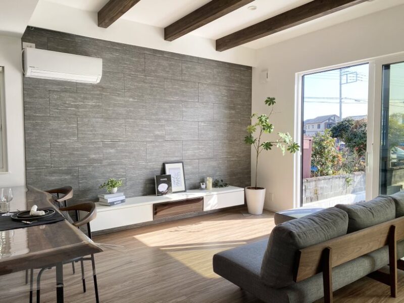 壁にタイルを使ったりと素敵なリビング空間になっています。