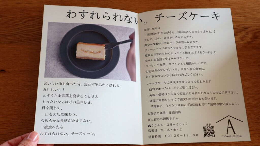 静岡県富士宮市弓沢町国道139号から交差点を曲がる。今回の目的地は住宅街の一角*平日金曜日の午後という時間本来ならこの路地を曲がる車はそう多くないはず。それでも私の前を2台の車が走る。目的地は・・同じでした。*『お菓子と珈琲 赤池商店』モデルハウスで開催している 『ゆったりSTAY&お取り寄せCafe』今回はお客様へお出しするスイーツとしてこちらのチーズケーキを選びました。*その名も『わすれられない。チーズケーキ』シーズンで変わるチーズケーキの構成それゆえ口へ運ぶその時を何度でも楽しませてくれるそんなチーズケーキです。*変えていく。それってスゴイ。その姿勢、私も刺激になりました。お客様にお出しするということで赤池さんがキレイなカット技も教えてくださいました。*カット写真撮り忘れましたがちゃんとカットできましたよ~アドバイスありがとうございましたお菓子と珈琲 赤池商店HP >>今回は皆様 高速道路を使い遠方からの御来場でした。帰り際の「来れてよかった!」ご家族の会話とても嬉しかったです。*さて来月もスタッフレセクトおすすめスイーツ付き『ゆったりSTAY&お取り寄せCafe』開催*スイーツを用意して御来場をお待ちしております。▽お問合せ▽LivingD第一建設(株) 本社静岡県富士市永田67-14電話:0545-52-9064企画広報室 小櫛*BessoALTANA | ベッソ・アルタナ静岡県富士市富士見台5丁目2-1東名高速道路 富士ICより10分TEL予約/お問合せ 0545-52-9064 ☑未来性能モデルハウス見学モデルハウス詳細・見学予約>>>3/13(土)3/14(日)『BessoALTANAゆったりSTAY見学&お取り寄せカフェ』【一日2組限定】>>☑︎『LivingD第一建設の家づくりについて知ろう!』3/7(日)まるっとゼミ>>*『その窓は新しい暮らしの入口でした。』<<LivingD第一建設では高性能トリプルガラス樹脂窓『APW430』HIBIKIpremiu標準採用>>高性能トリプルガラスで、世界トップクラスの断熱性能を実現。シンプルなデザインで、美しい外観を演出。世界トップクラスの断熱性能と先進の機能高いデザイン性をもち合せた窓です。*高性能の樹脂窓で住宅を高断熱化することでエネルギー消費の削減はもちろん住宅の温熱環境を改善し快適な住環境を実現させます。『その窓はあたらしい暮らしの入口でした』詳細 YKKap HP>>>