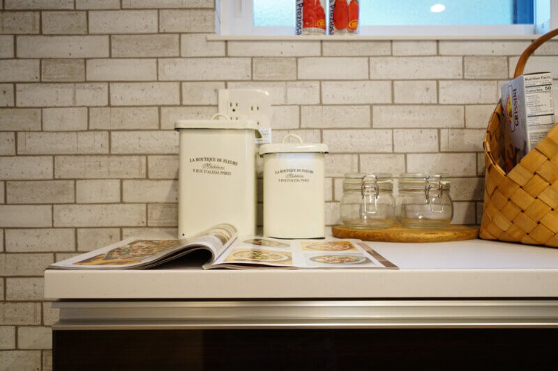 キッチンの壁はアクセントでレンガ調クロスを選びました。