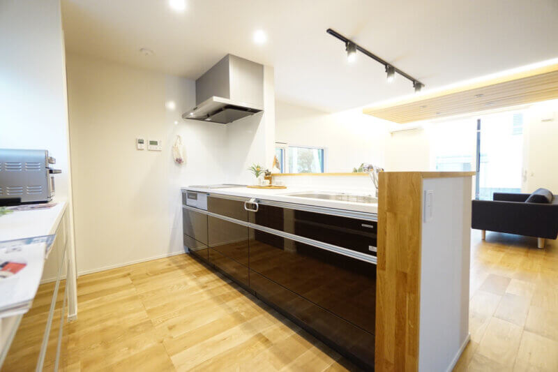 キッチンからリビングダイニングを見渡せてうれしい。