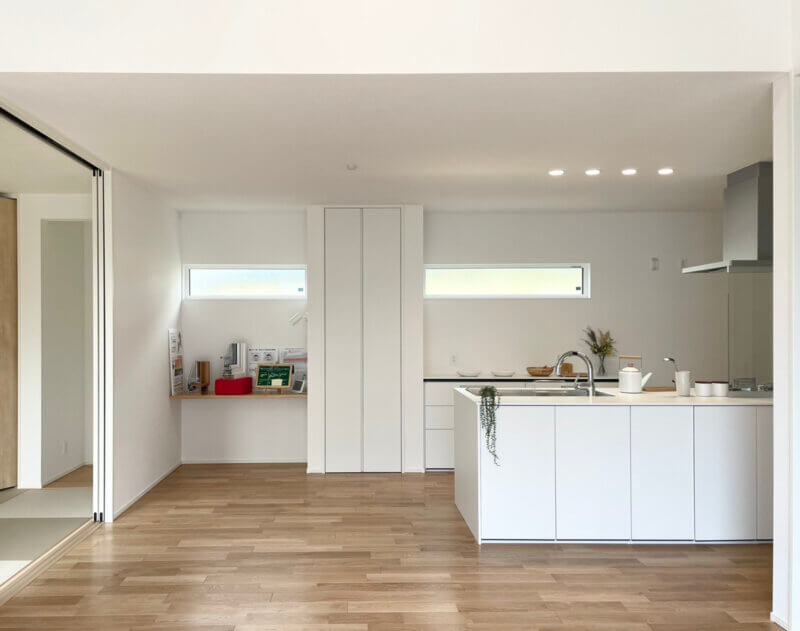 こんにちは♪ スタッフの成田です。 今日は、見学会の準備に行ってきました。 全体的に白を基調としてデザインされているので 無垢の床材が強調されてとてもおしゃれな空間です😊 広々としたアイランド型キッチンは 家族と会話しながら楽しく料理ができます♪ 私のオススメポイントはこちらの洗面台です。 間接照明で落ち着いた雰囲気に仕上げたこの洗面台は 奥様のこだわりが詰まった造作洗面となっております♪ 会場は事前予約にてご見学いただけます。 土地の魅力を生かした平屋のお住まい ぜひご来場ください🌸🌸 ▽詳細・ご予約はこちらから▽