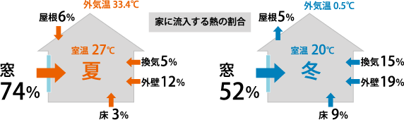 夏には約74%、冬には約52%もの割合で窓から熱が入るといわれているのです。