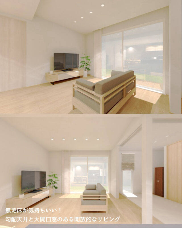 無垢床が気持ちいい!勾配天井と大開口窓のある開放的なリビング空間