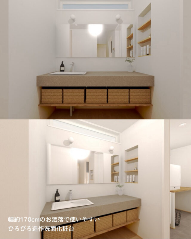 ☑ 幅約170㎝のお洒落で使いやすい広々造作洗面化粧台