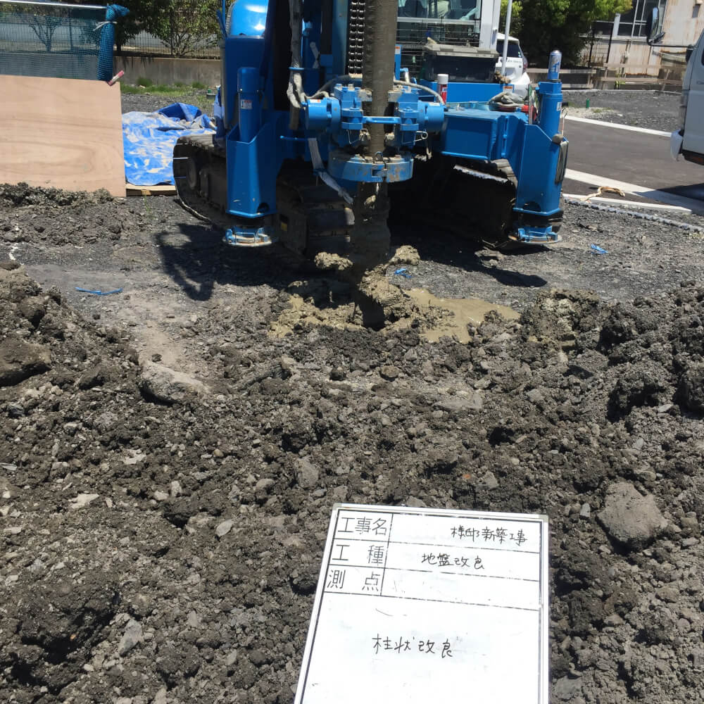 柱状改良という工法で、ドリルで硬い地盤まで掘削し、