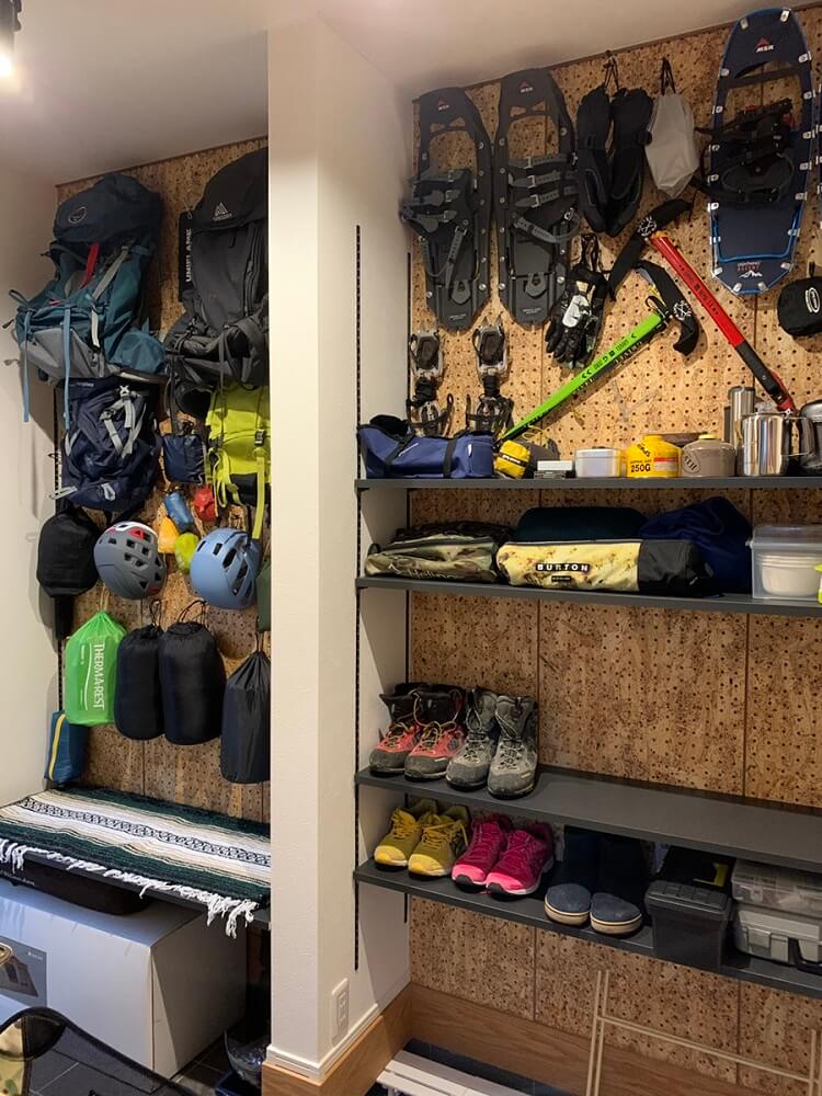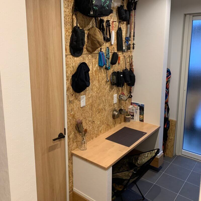壁に道具がかけられるようにOSBの有孔ボードを施工(オーナー様の希望にて)