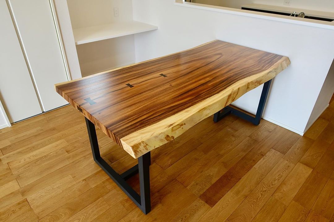 無垢一枚板テーブル納品しました︎ . 個性的な木目が魅力のモンキーポッド一枚板テーブル。