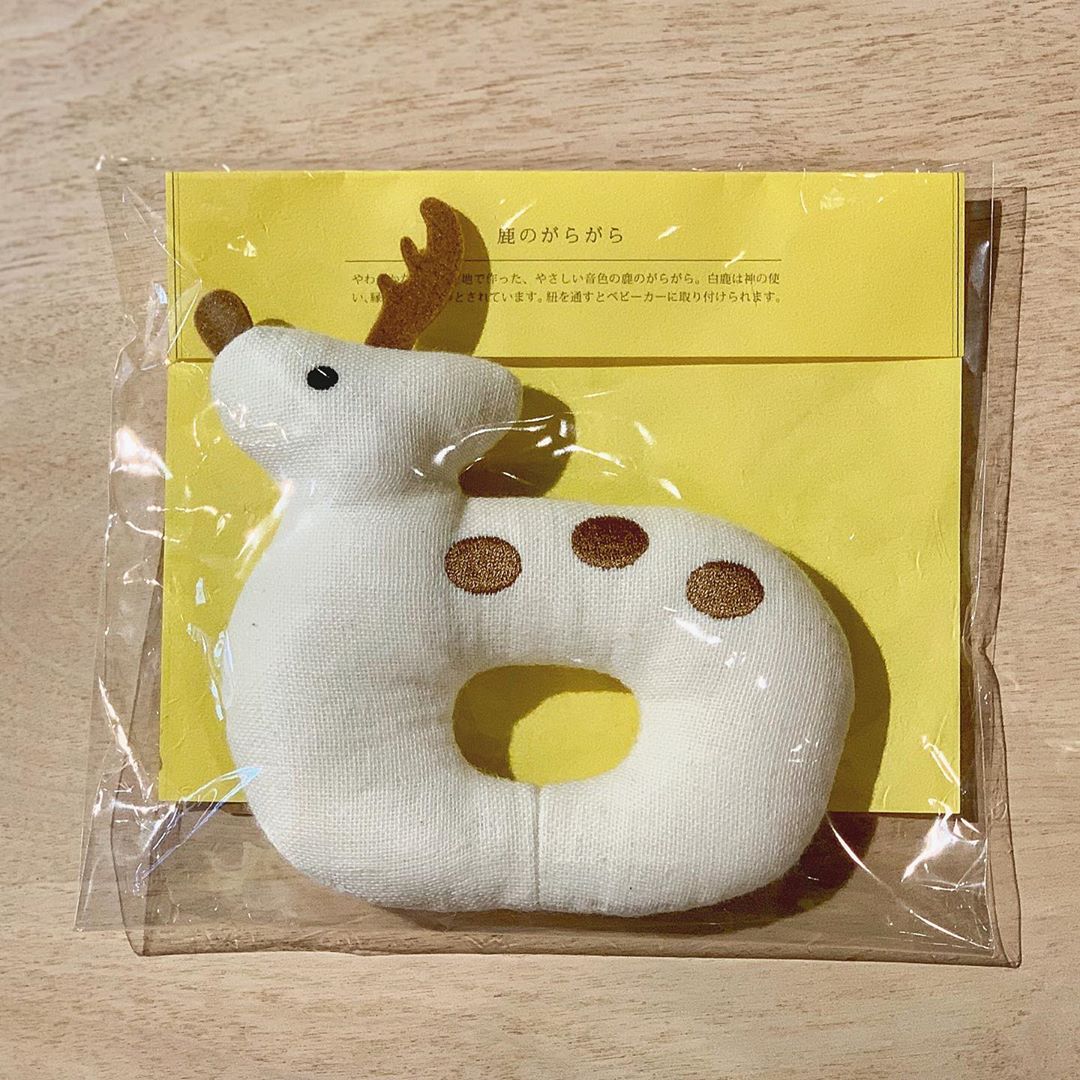柔らかなガーゼ生地で作った、やさしい音色の鹿のがらがら。白鹿は神の使い、縁起の良いものとされています。