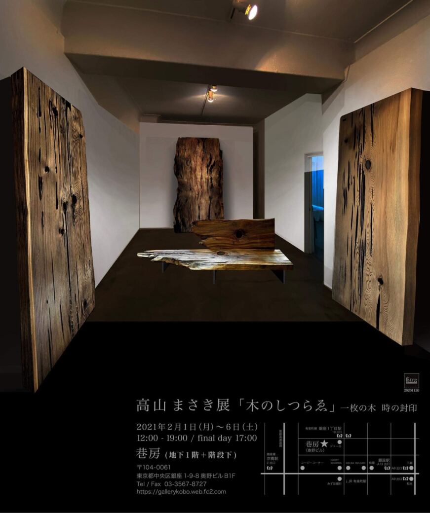 一本の木 一枚の木から 木のしつらゑ 展 2021/2/1〜 2/14 MUKUTEN|ムクテン|Exhibition EXHIBITION 一本の木 一枚の木から 刻の封印 木のしつらゑ展 東京銀座 2/1〜2/14 ■アートギャラリー巷房(地下1階+階段下)|2月1日(月)~7日(日)■森岡書店|2月9日(火)~14日(日)■万画廊|2月9日(火)~14日(日) 第一建設の家具インテリアショップ「ハナレアルタナ」のオリジナル家具ブランド「MUKU ten. Premium」のアートプロデュースデザイン監修を手掛ける、高山まさき氏(株式会社エトルデザイン代表) https://etredesign.jpひとつとして同じものがない「一本の木、一枚の木」を大切に、「一本の木、一枚の木から」全ての部材を切り出す家具を創ります。 日本古来の自然美に着目し、ふたたび輝かさせるデザインとその手法には、自然物へのリスペクトが感じられ、新たな試みへの期待を抱かせます。 2021年2月から東京銀座の3ヵ所にて、高山氏による作品展示会を開催いたします。空間を知り尽くしたアーティストならではの、「木のしつらゑ」をご覧ください。 「MUKU ten. Premium」展示会・家具作品オーダー・購入についてのお問合せはインテリアショップHANARE ALTANA までお気軽にどうぞ。https://living-d.jp/altana/hanare/ 一本の木 一枚の木から 木のしつらゑ Ki no shitsurae Furniture MUKUten.com プレミアムページ →