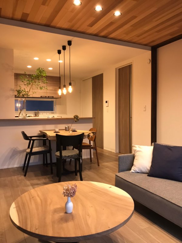 リビングの天井にはレッドシダーを貼り木の暖かみのあるリビングです。